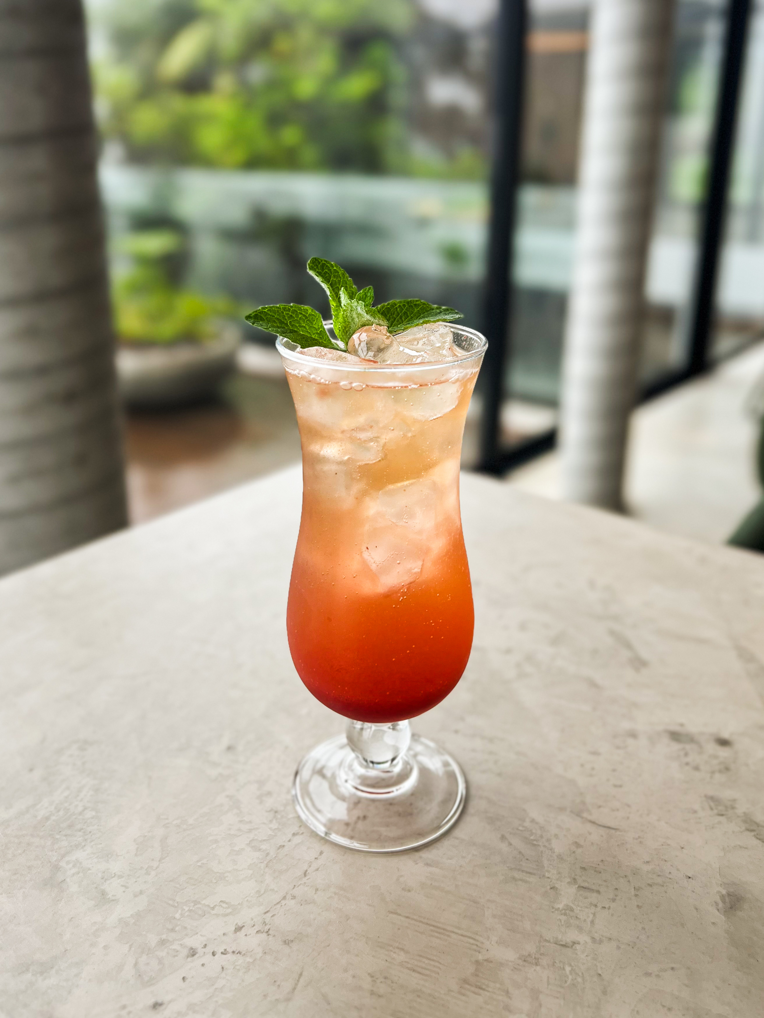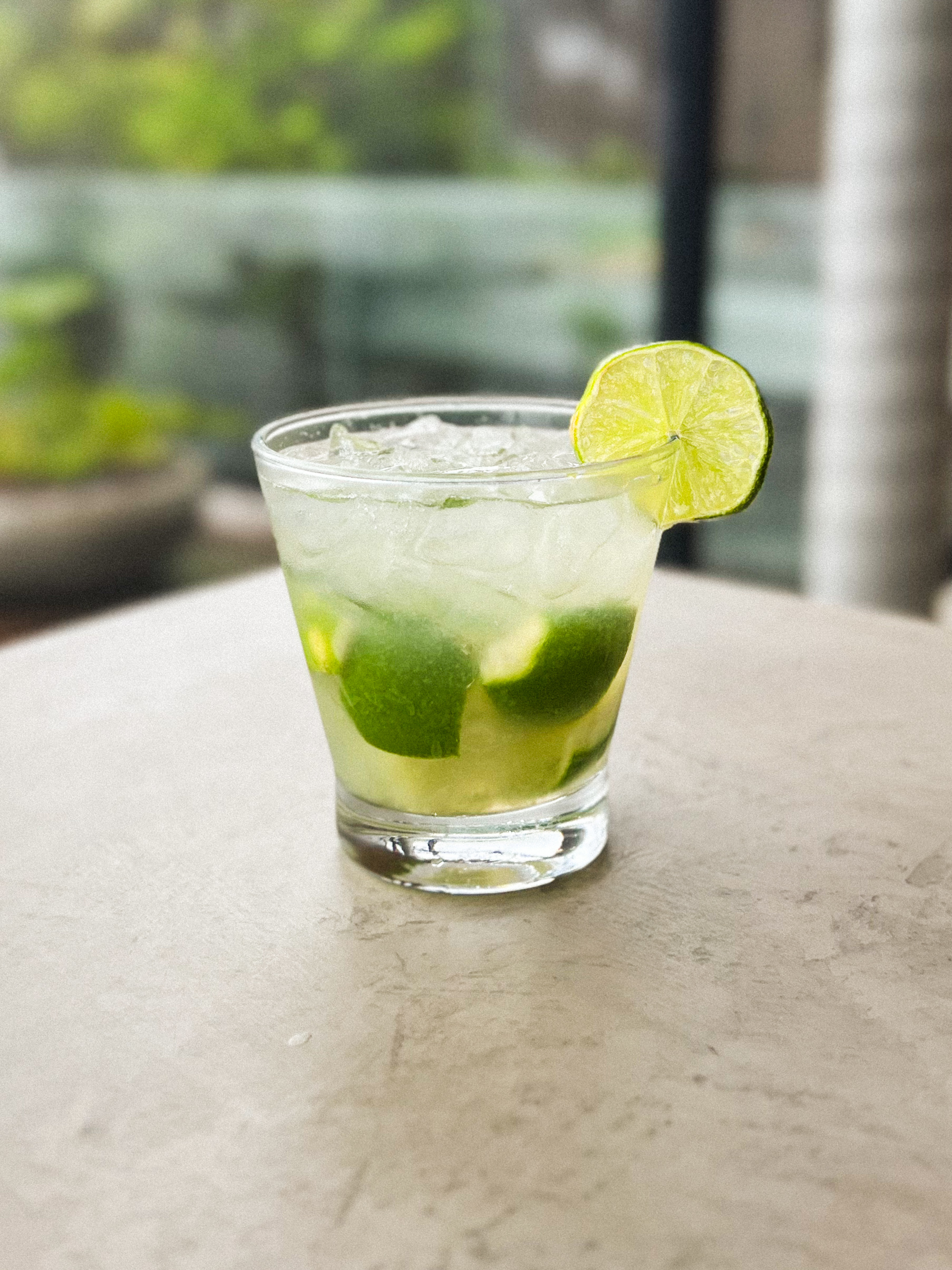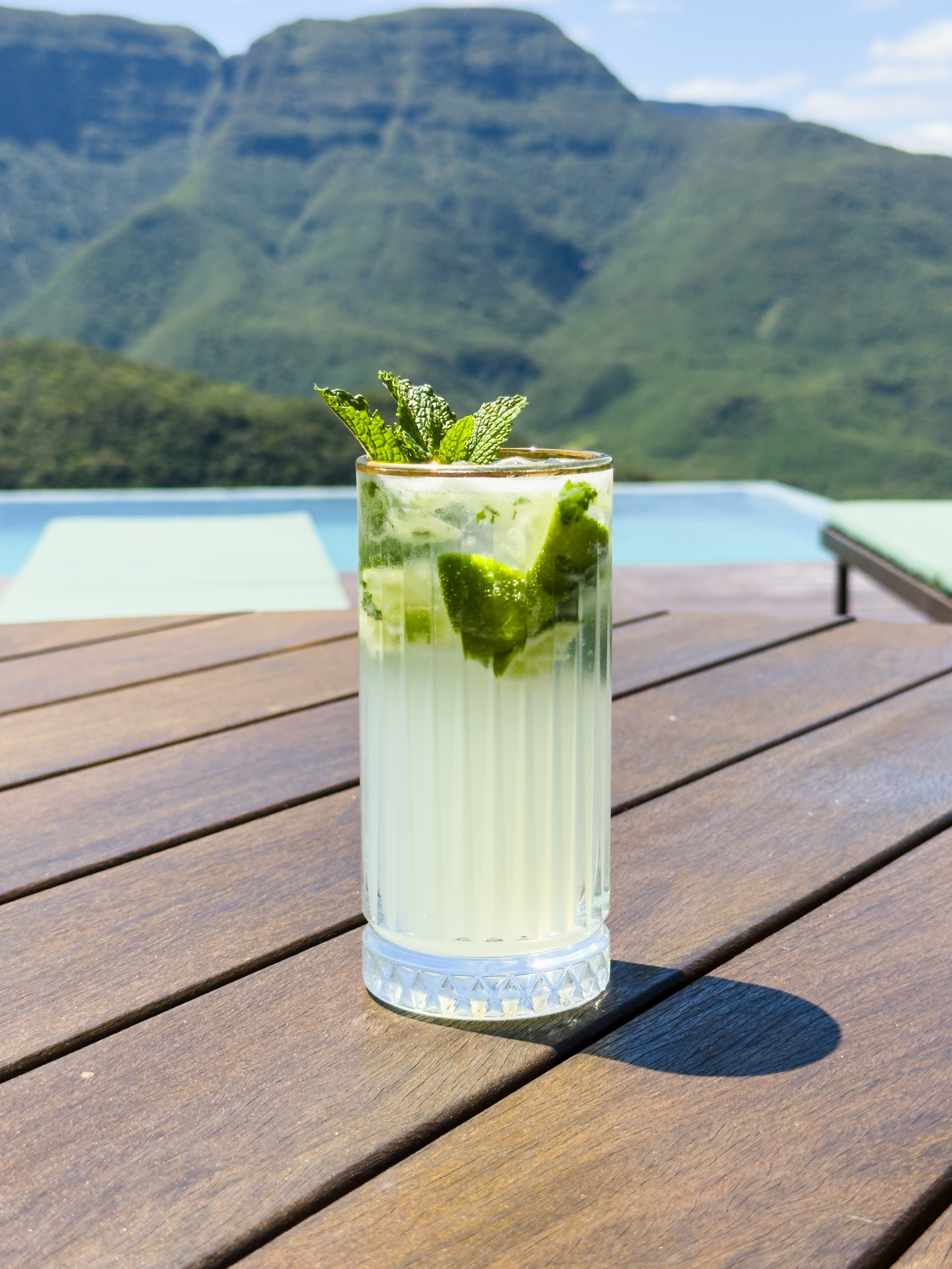 Rum, hortelã, frutas, Xarope simples, suco de limão e água gaseificada.