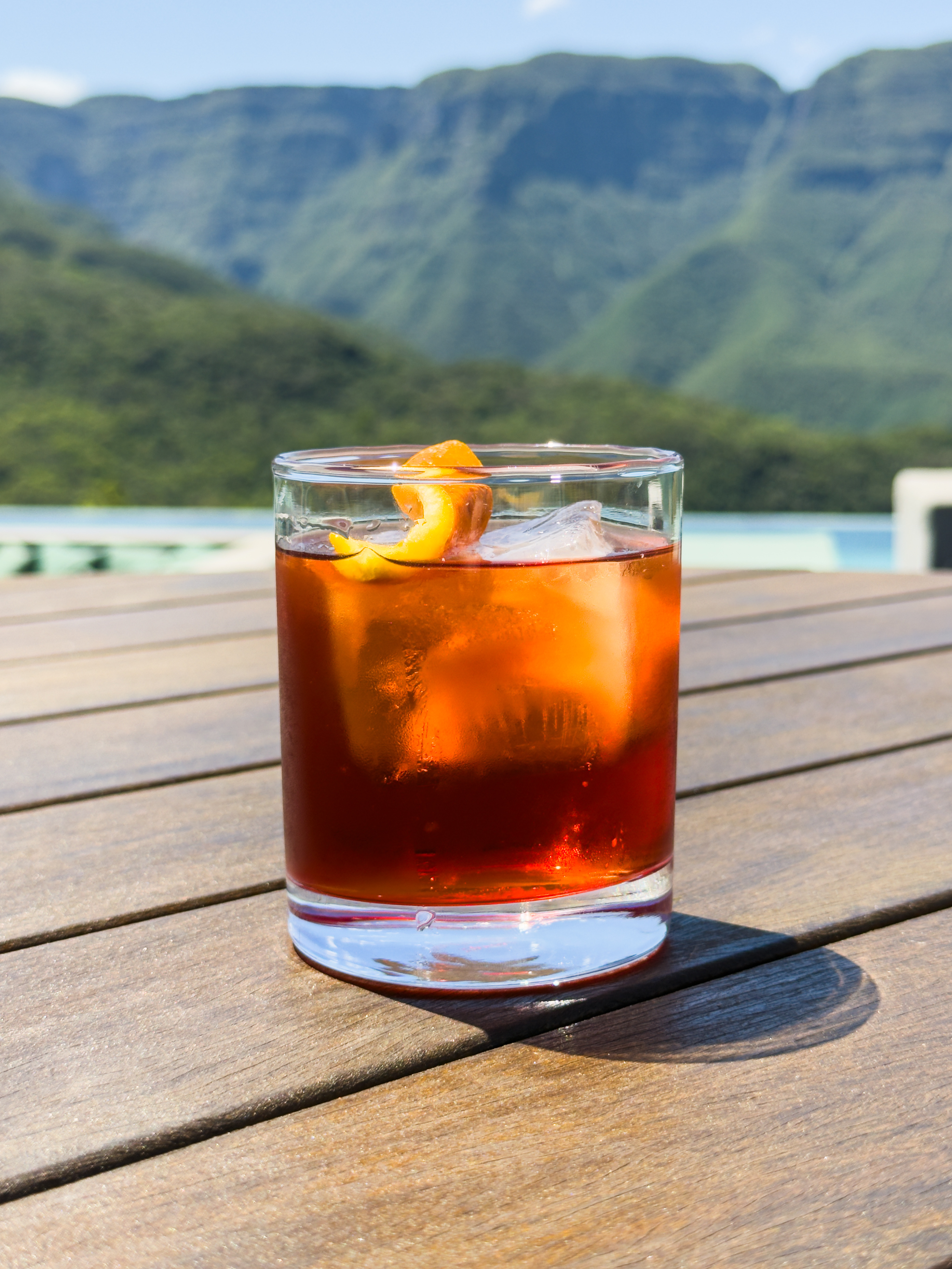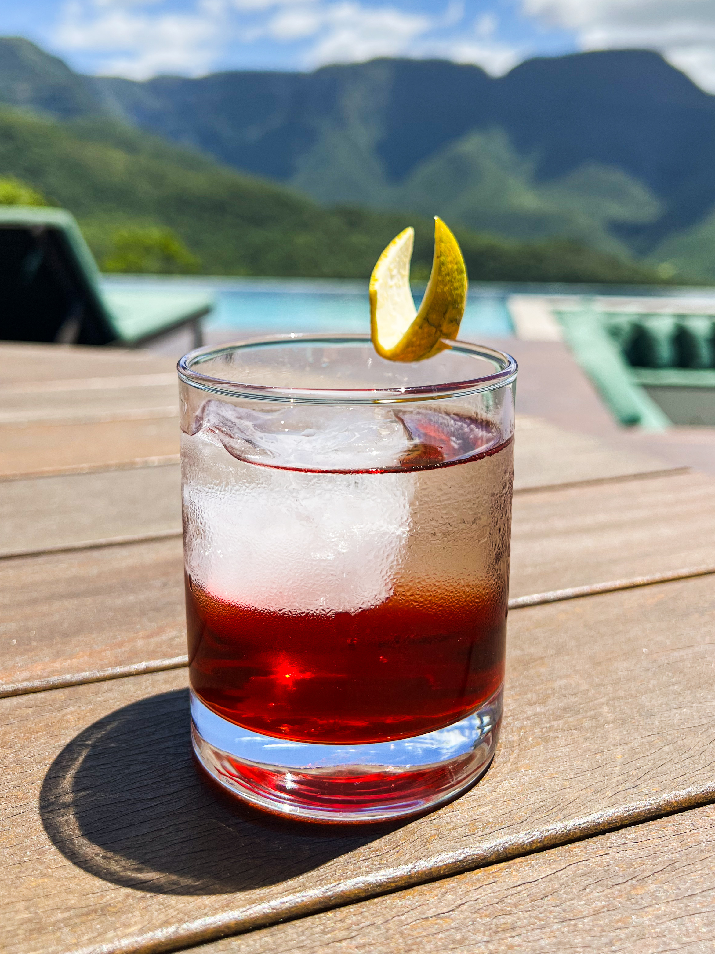 Gin, Vermouth rosso, suco de limão siciliano, xarope de Granadine e clara de ovo.