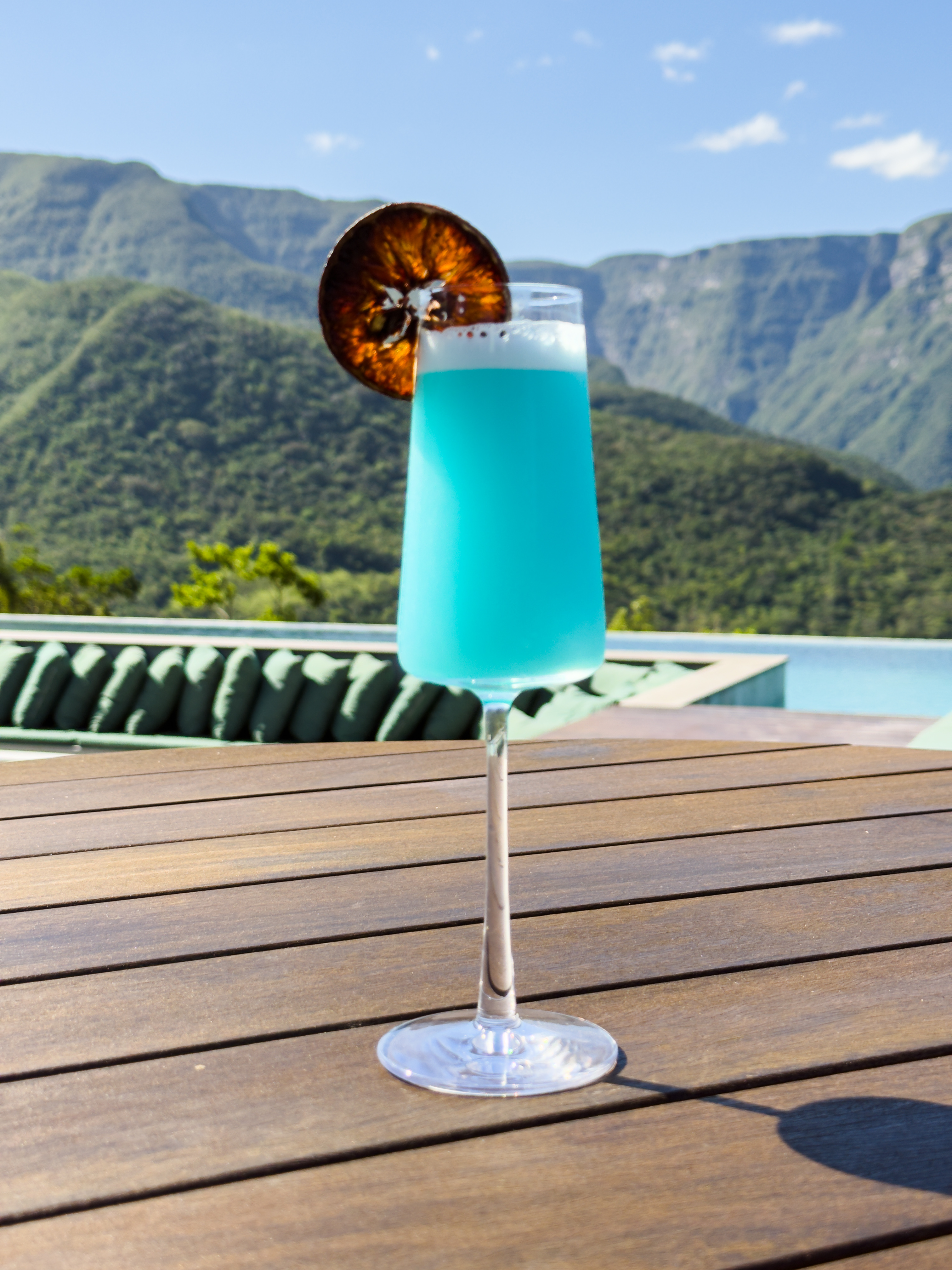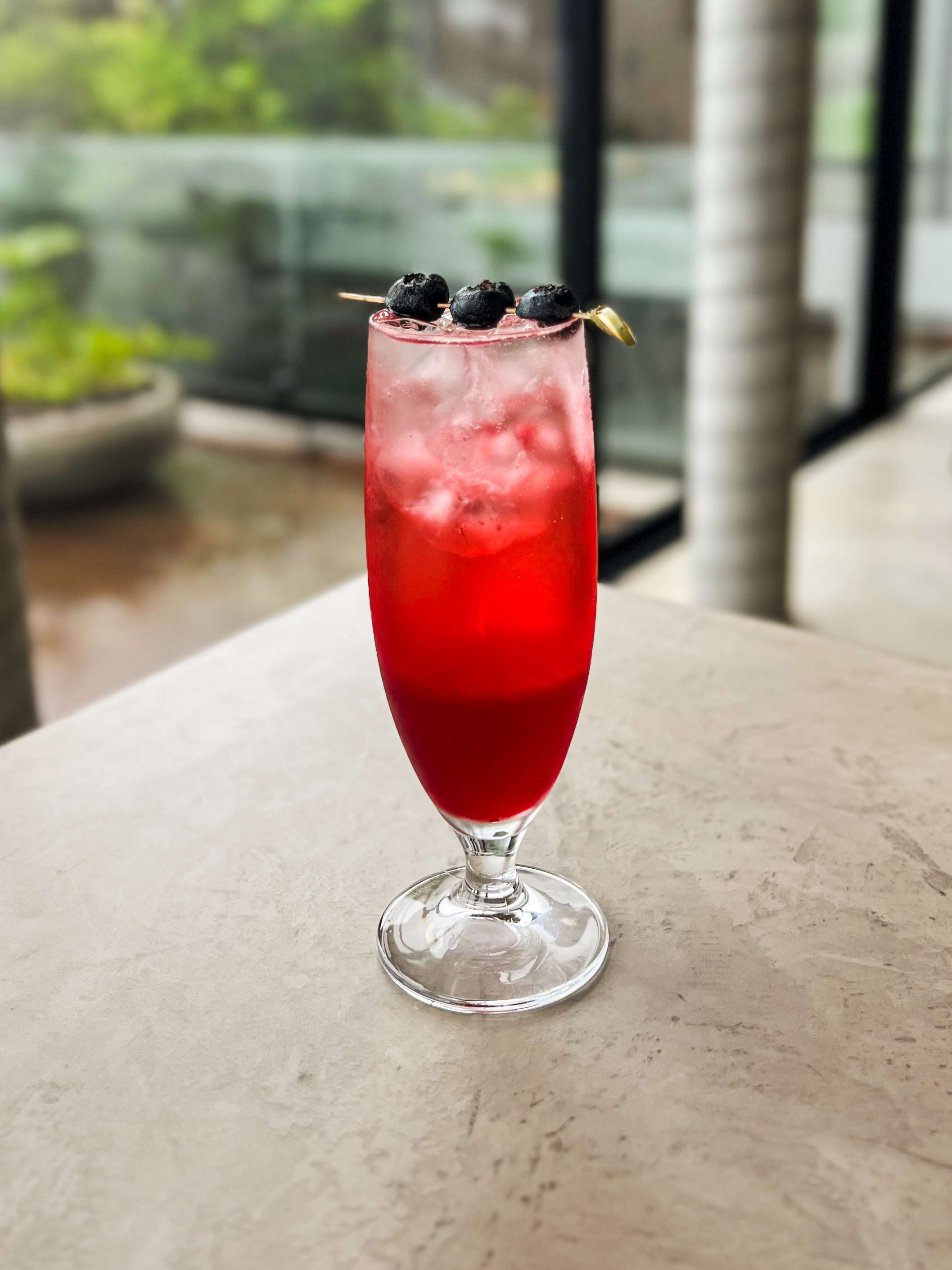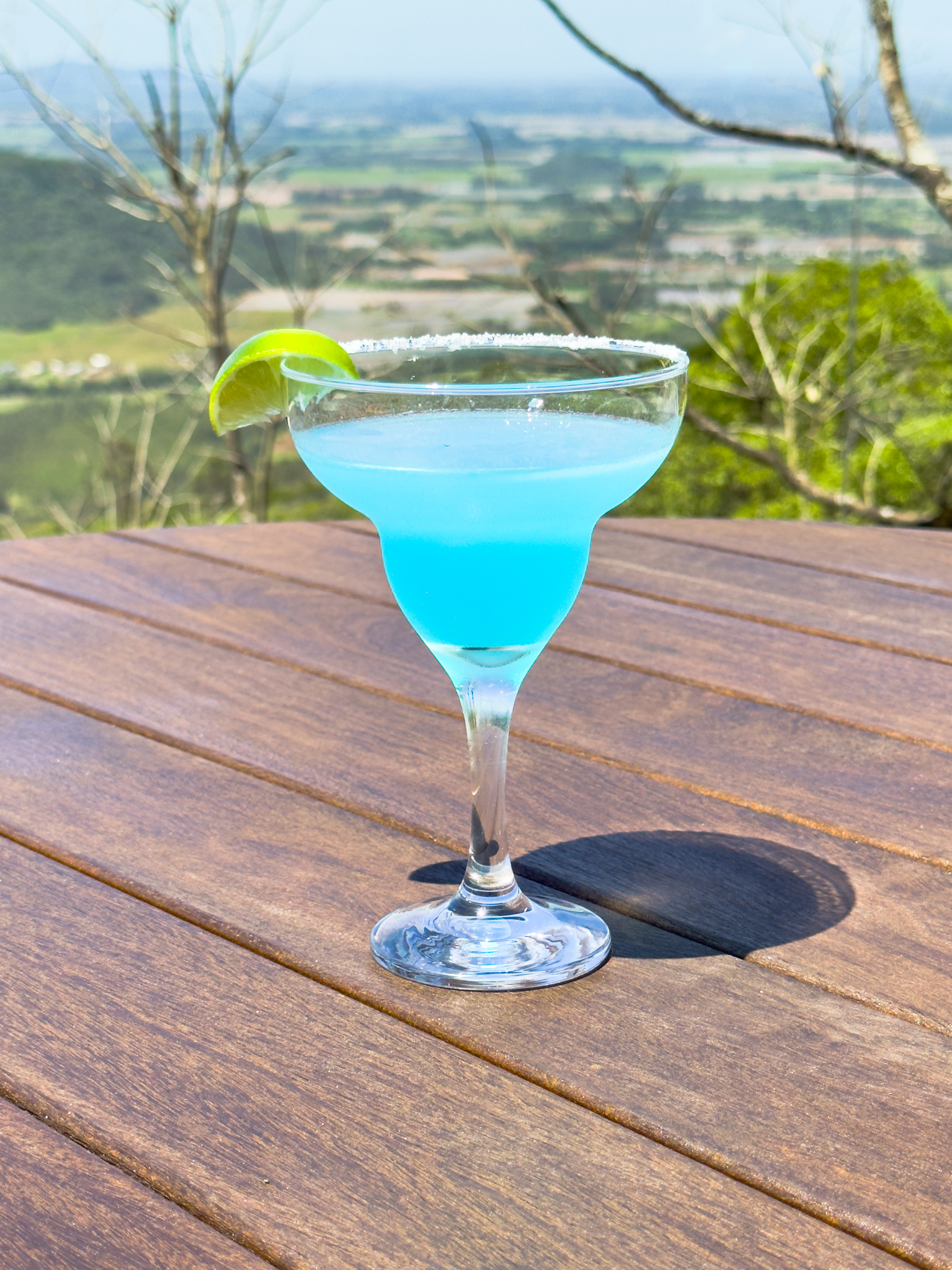 Gin, Xarope simples, suco de limão siciliano e Curaçau blue.