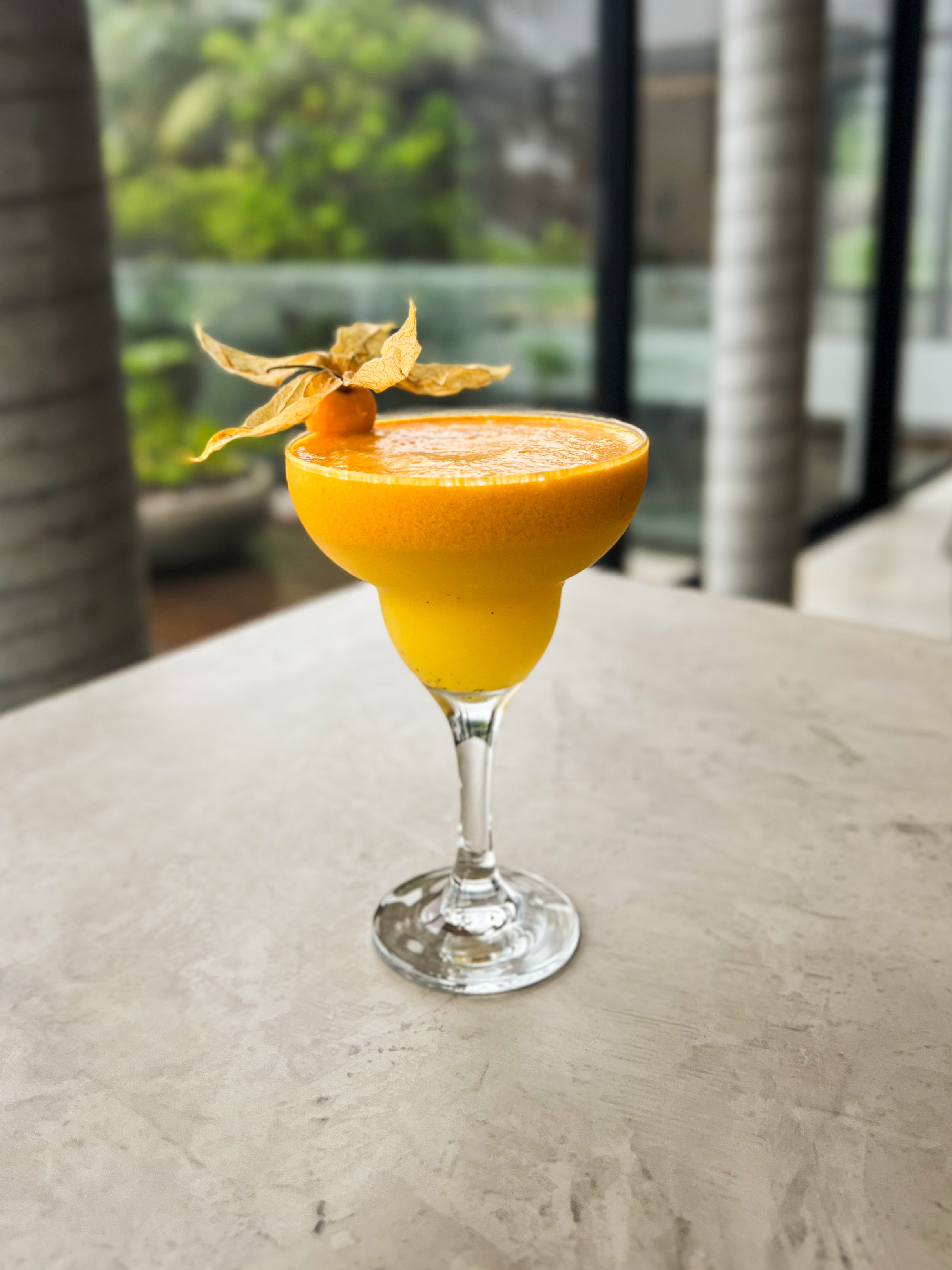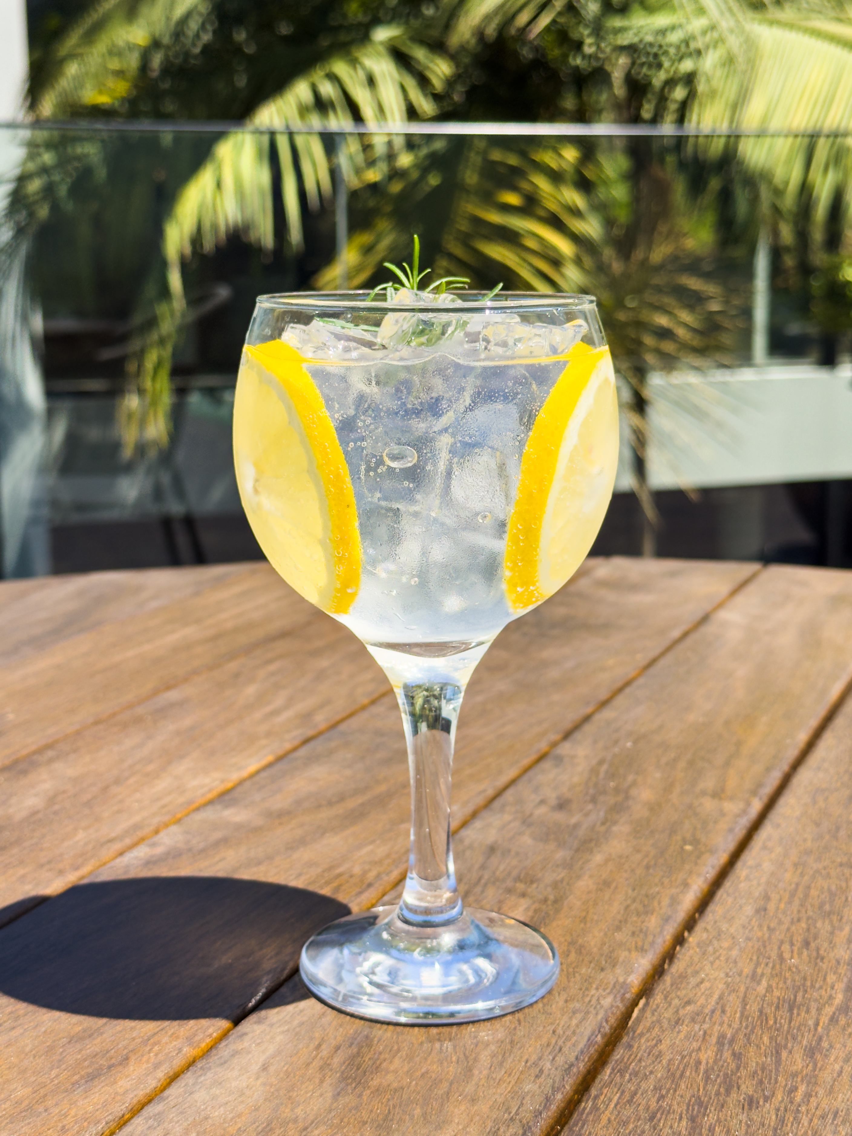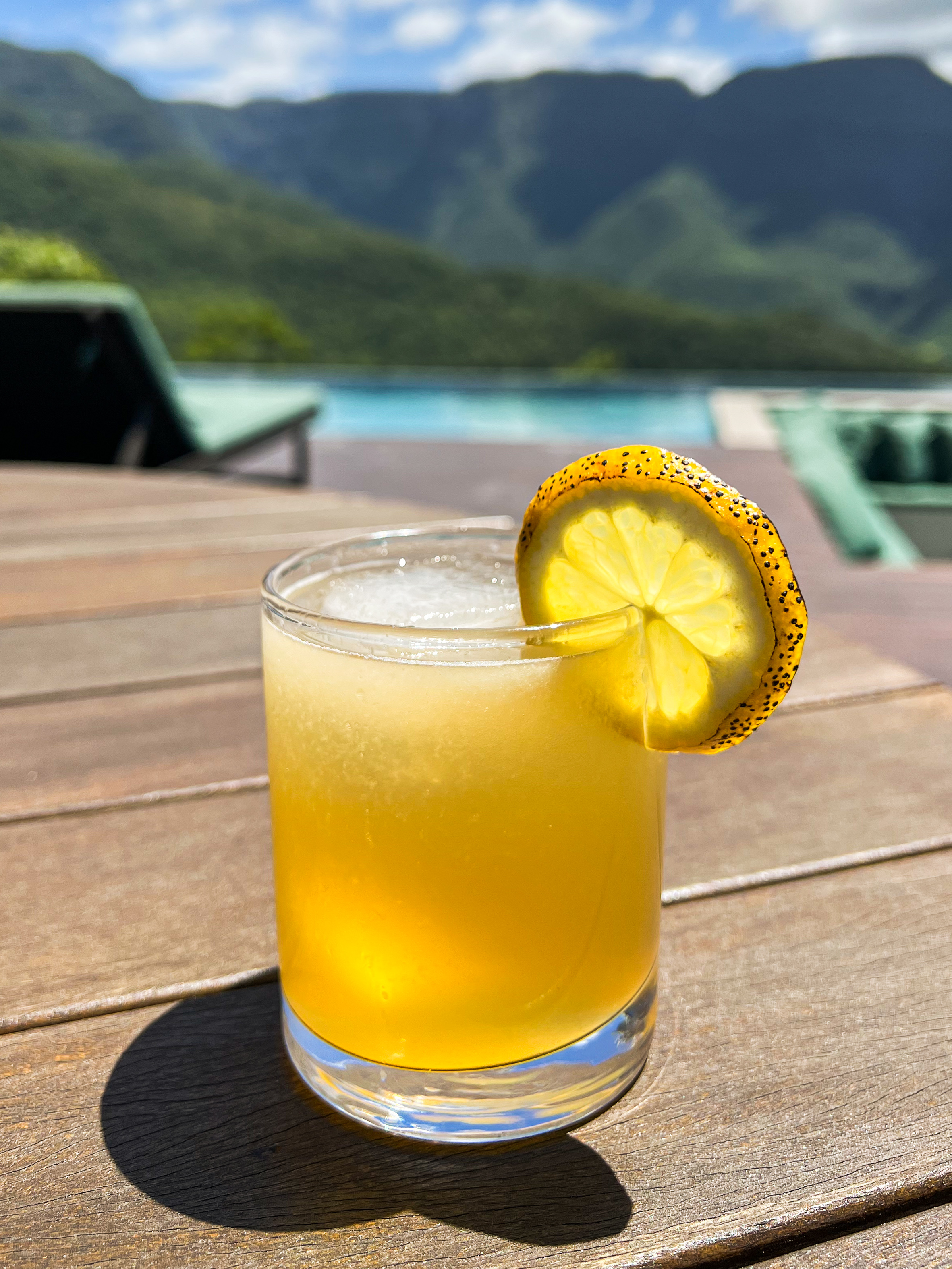 Gin, Xarope simples, suco de limão siciliano e Curaçau blue.