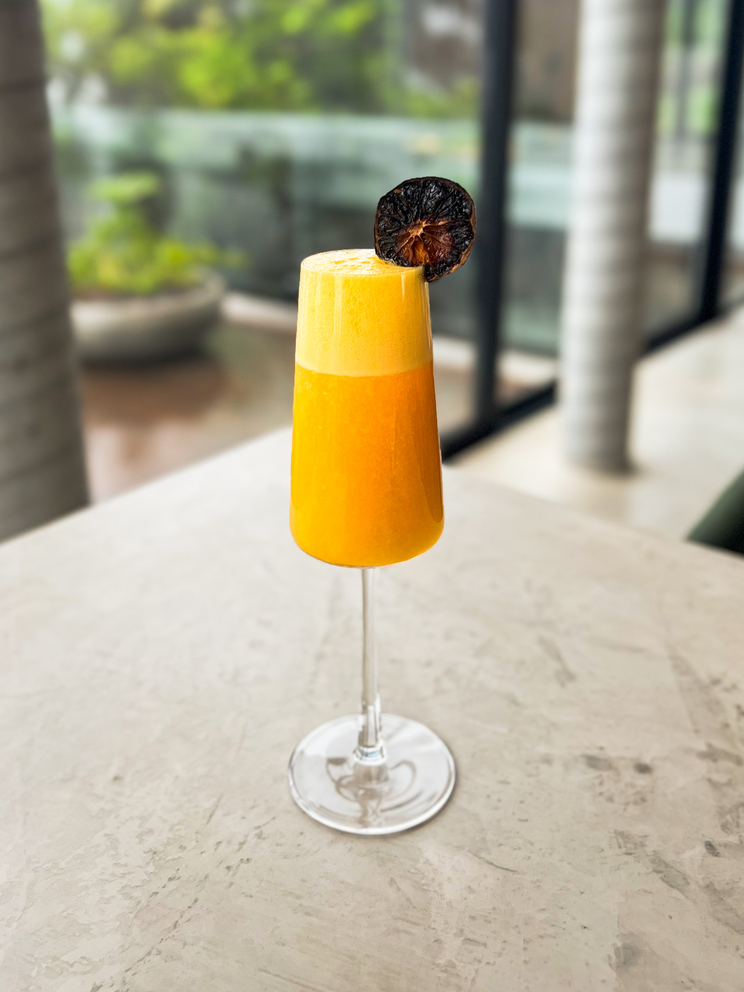 Tequila, suco de laranja, licor de pêssego e Grenadine.